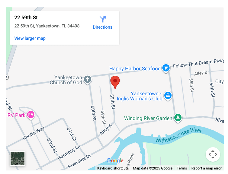 Directions Tournament Headquarters — Inglis Yankeetown Lions Club GPS ADDRESS FOR THE TOURNAMENT:22 59th Street, Yankeetown, Fl. 34498(This is the address for the Lions Club Bui Open Google Map Like Loading...